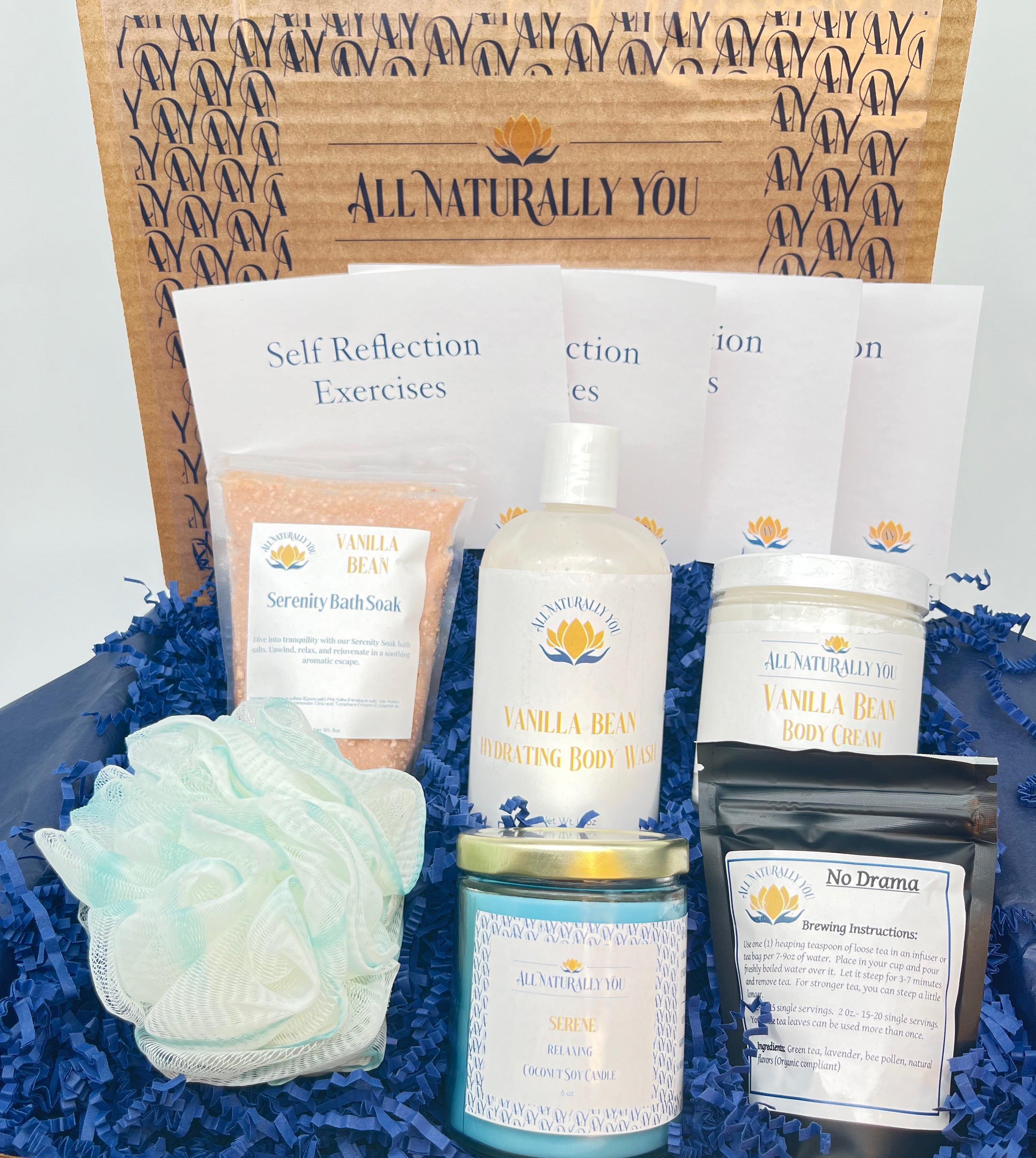 Our Grand Prize Box includes one spa item, body wash, body cream (6oz), scented candle (6oz), 4 self discovery exercise, loose tea of the month.