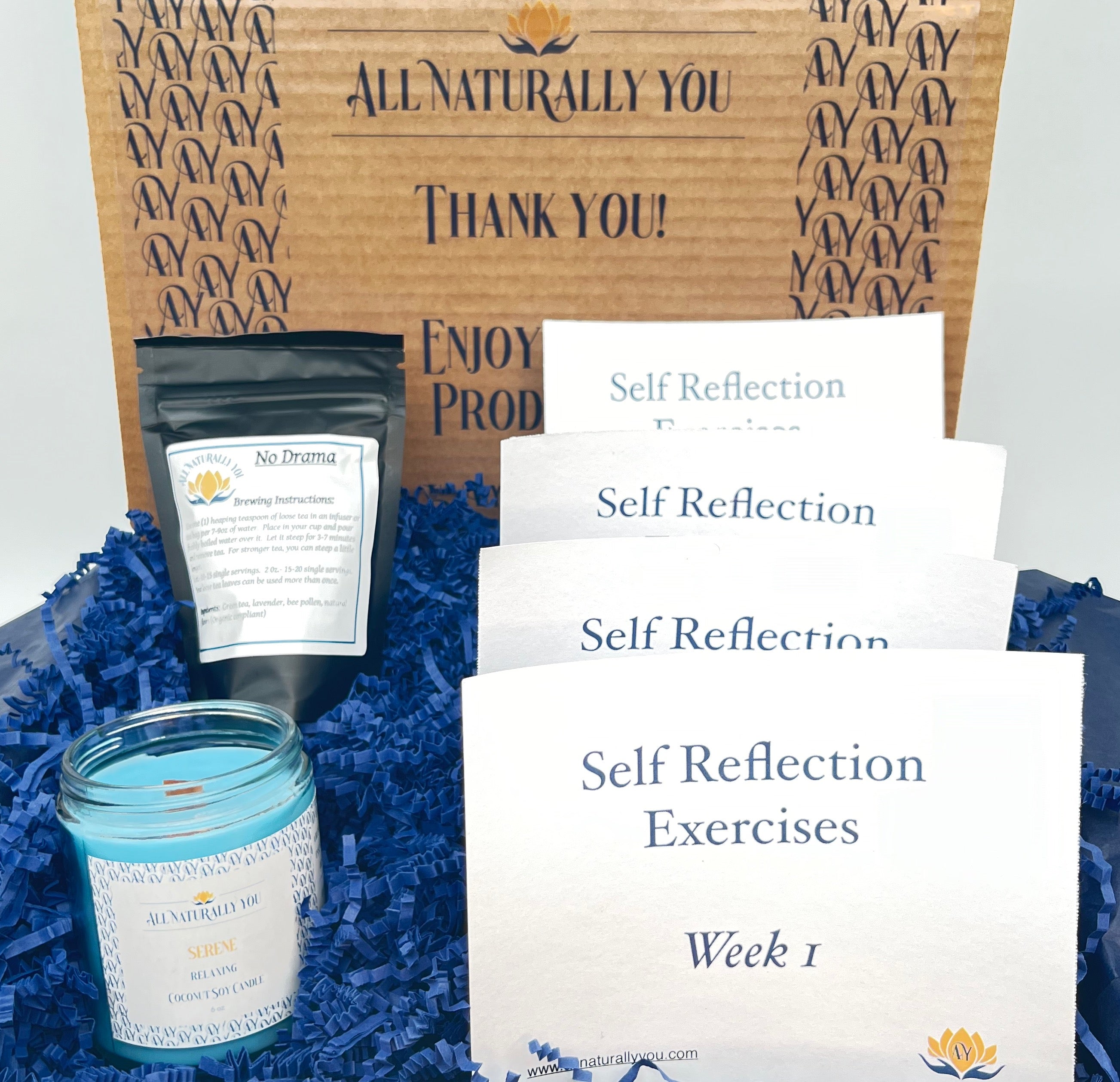 Includes 4 self discovery exercises, affirmation or gratitude item, loose tea of the month, scented candle