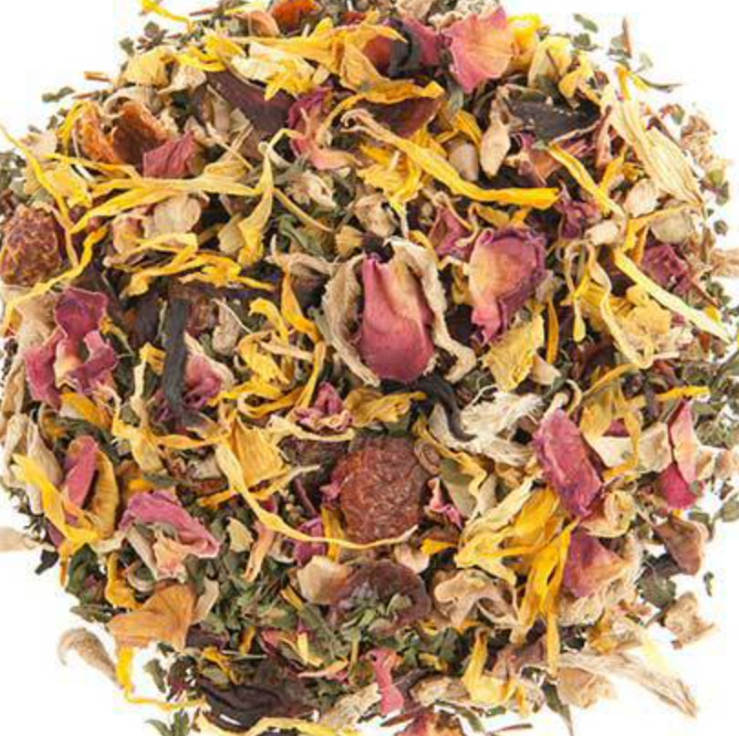 Peppermint leaves, Rose hips pieces, Spearmint leaves, Ginger, Rooibos, Hibiscus, Rose, Calendula, Osmanthus petal